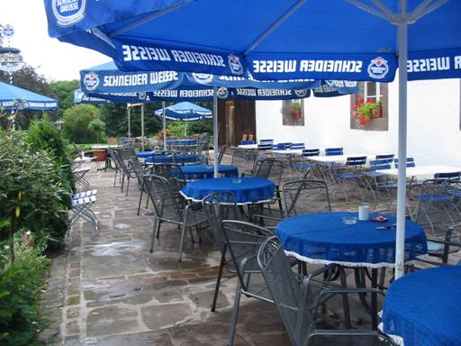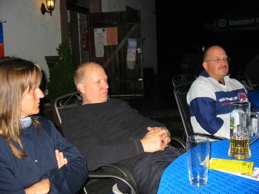 Auch wenn es zwischendurch weiter regnete, boten die Schirme genügend Deckung, so daß wir hier sitzen bleiben konnten. Leider wurde an diesem Abend die Scheune auch nicht geöffnet. |