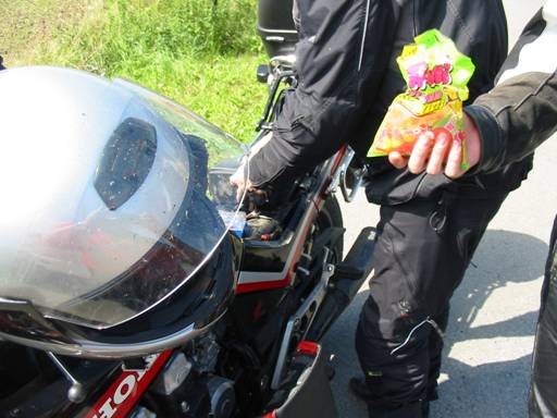 Nachdem wir uns wieder auf den Weg gemacht hatten, kam, was in dieser Saison wohl nicht ausbleiben konnte: jener betagten und inzwischen berühmten Diva namens Honda gingen die Lichter aus. Aber immerhin war es nur der linke hintere Blinker, der schnell wieder in Gang gesetzt werden konnte. |