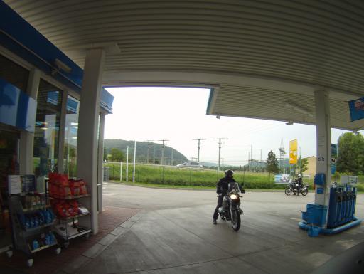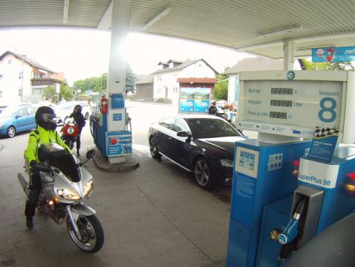 Allerdings hieß es auch gleich wieder anhalten, denn am Abend zuvor hatte so richtig niemand an das Tränken der Rösser gedacht. Also hinein ins blaue Wunder und Sprit gefasst. |