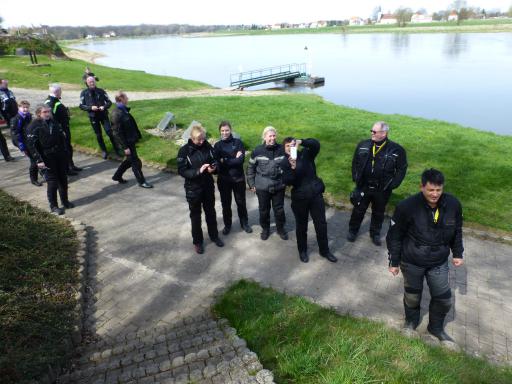 wartete auf den großen Tross, den wir wir zu vermeiden suchten. Über Facebook hatten sich Leute zu einer Tour verabredet und man erwartete bis zu 500 Motorräder. Glücklicherweise waren wir ihnen zuvor gekommen. So konnte es ein kurzes Stück über Falkenberg/Elster, Saxdorf und bei Mühlberg über die Elbe nach Strehla gehen, unserem heutigen ersten Ziel.