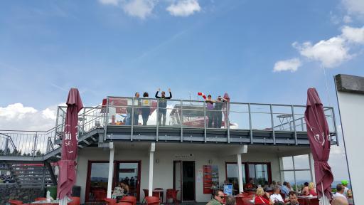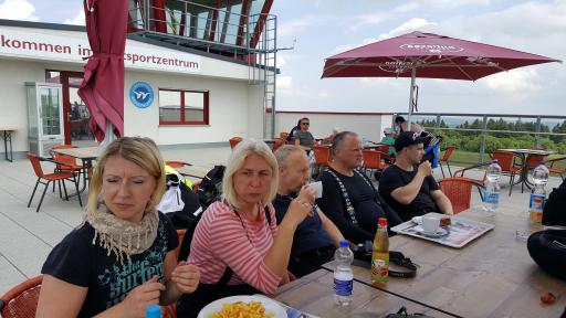 Das nächste Zwischenziel war die Wasserkuppe, die mit ihren 950 Metern die höchste Erhebung der Rhön und auch des Landes Hessen ist. Schon seit mehr als 100 Jahren wird der Berg als Segelflughafen genutzt. Dementsprechend haben sich hier Fliegervereine und Flugschulen angesiedelt. Für uns die Gelegenheit für einen Imbiss.