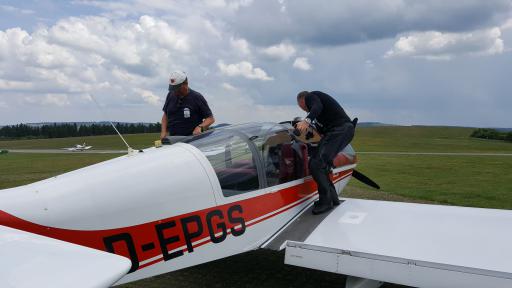 Weil es so verlockend klang, nutzten Lutz, Mike und ich die Gelegenheit für einen Rundflug über die Rhön. Wir wurden vom Rest der Mannschaft verabschiedet.