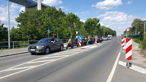 Wir machten uns wieder auf den Heimweg. Um der Abwechslung Raum zu geben, ging es diesmal über die Alte Rügenbrücke zurück aufs Festland. Weil sie viel tiefer liegt, mussten Wartezeiten für kreuzende Schiffe eingeplant werden. Aber nicht nur das: fröhlich fernlichtblinkende Fahrzeuge bereiteten uns rechtzeitig auf eine Laser-Falle vor. Am Ort des Geschehens angekommen, quittierte einer der Beamten es mit Humor: auf meinen freundlichen Gruß am nicht vorhandenen Mützenschirm hin begleitete uns seine tiefe Verbeugung. ;-)